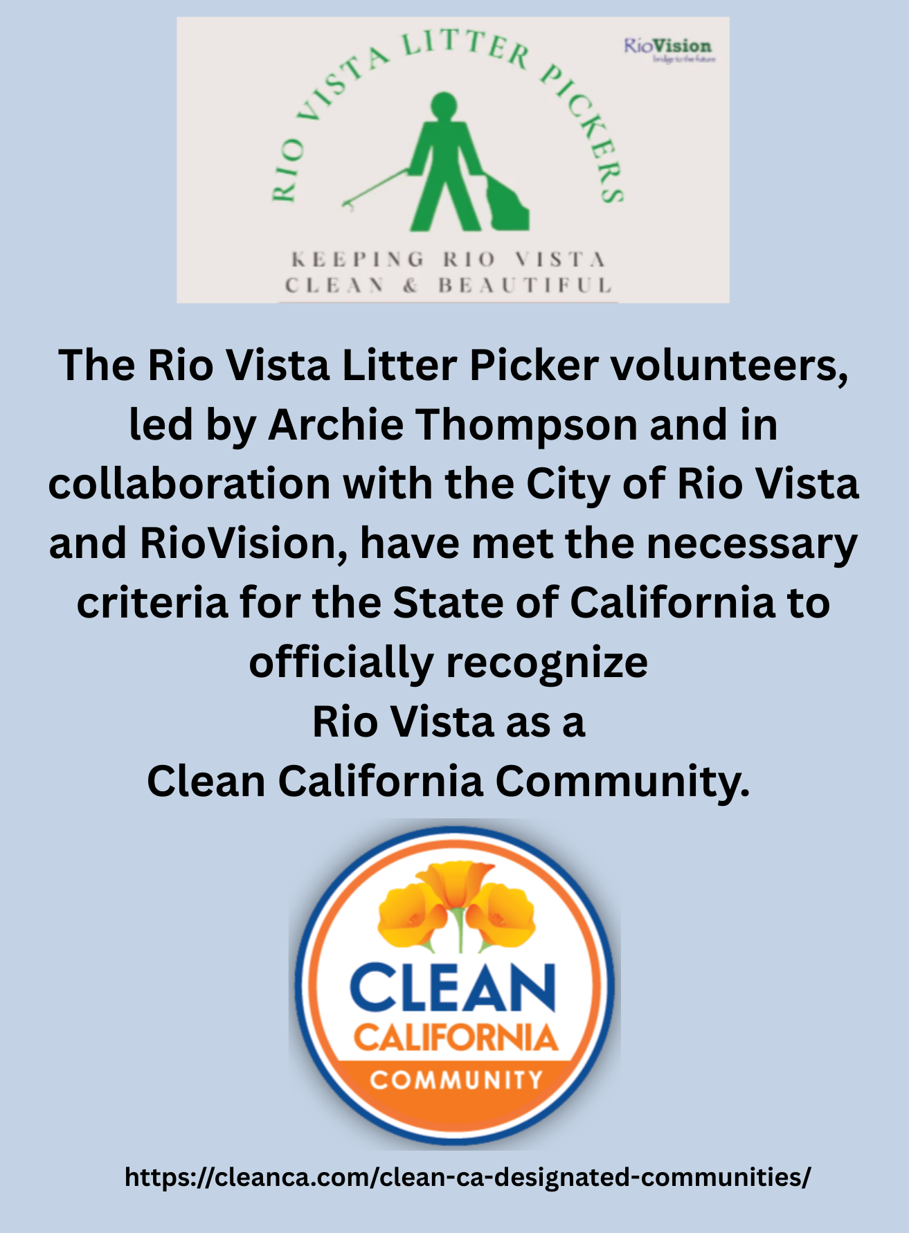 Archie Thompson and his wife Catherine moved to Rio Vista from Monck Corner, South Carolina. While living in Monck Corner, which is in Berkeley County, Archie was a leader in the Keep Berkeley Beautiful organization, an affiliate of the Keep America Beautiful organization. When Archie and Catherine moved to Rio Vista, they saw a need to continue working to keep Rio Vista beautiful, but without the organization they became the Rio Vista Litter Pickers. Working to remove litter along the roadways, the Waterfront Promenade, along Airport Road and picking up the litter at the Western Entrance. Archie’s goals fit with RioVision so we have joined forces. Archie will be the program leader and help reduce litter, improve recycling efforts and beautify Rio Vista. We welcome his vision for our mission. You can find Archie on Facebook at Rio Vista Litter Pickers. If you’re interested in joining the Litter Picker team send an email to [email protected]